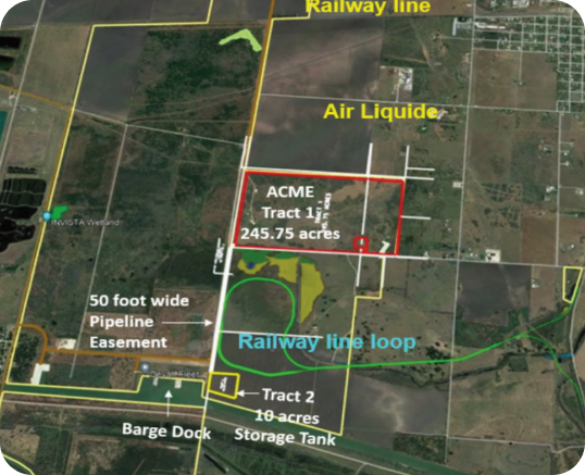 • 246 acres H2 & NH3 process plant & 10 acres for storage tank with 50 feet wide pipeline easement to barge dock, Port of Victoria, Texas.